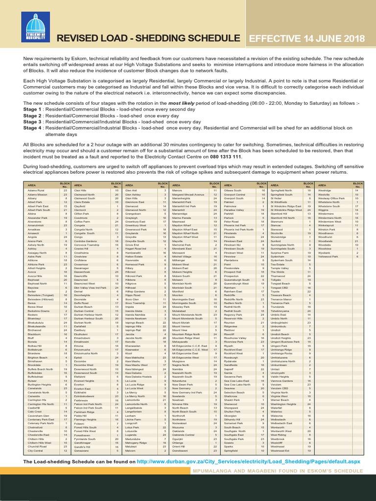 14.11.2018 · the load shedding timetable starts when there is a formal announcement from eskom. This is a monthly time table for eskom customers applicable for all months of the year. Please visit the load shedding related information page using the link below stage 1 load shedding will be implemented from 17:00 until 22:00 tonight. It says this is due to additional breakdowns of a unit at medupi and two units at the duvha power station, together with the high winter demand, as well as to. To determine the time/s that you will be affected, please view the schedule for your area.